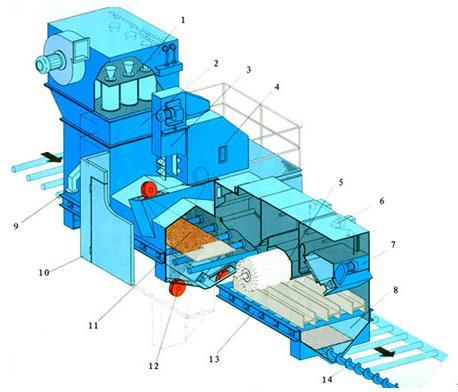 鋼材連續運行到室內彈丸拋射區時,周圍各個面都受到不同方位的連續均勻拋射清理。